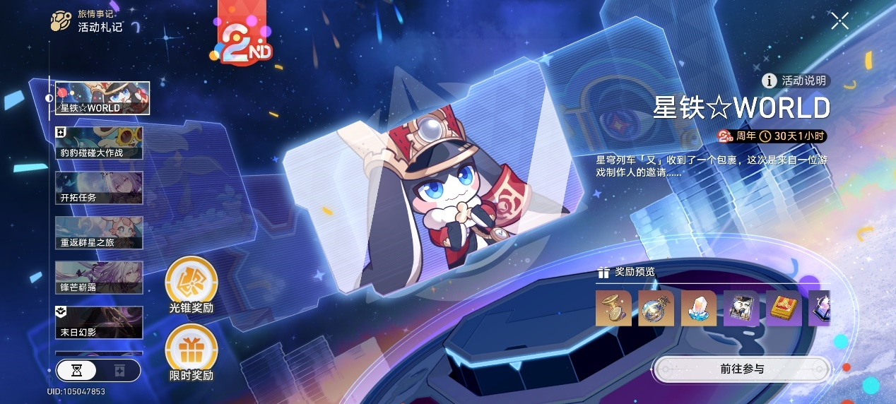 • 常驻活动:崩铁每一次大版本更新都会新加入常驻活动,常驻活动通常以剧情/小游戏/战斗的方式进行,在新版本完成活动可以获得活动光锥(武器)。