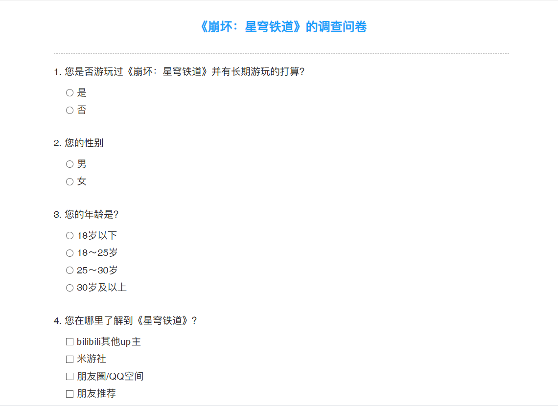 • 问卷调查:崩铁在版本末期会在邮箱中发送问卷调查,了解玩家对于当前版本的满意程度,在完成调查问卷后获得少量资源奖励。调查问卷可以很好的反馈玩家的意见,了解玩家的需求在什么区间,不过需要对调查问卷进行筛选。
